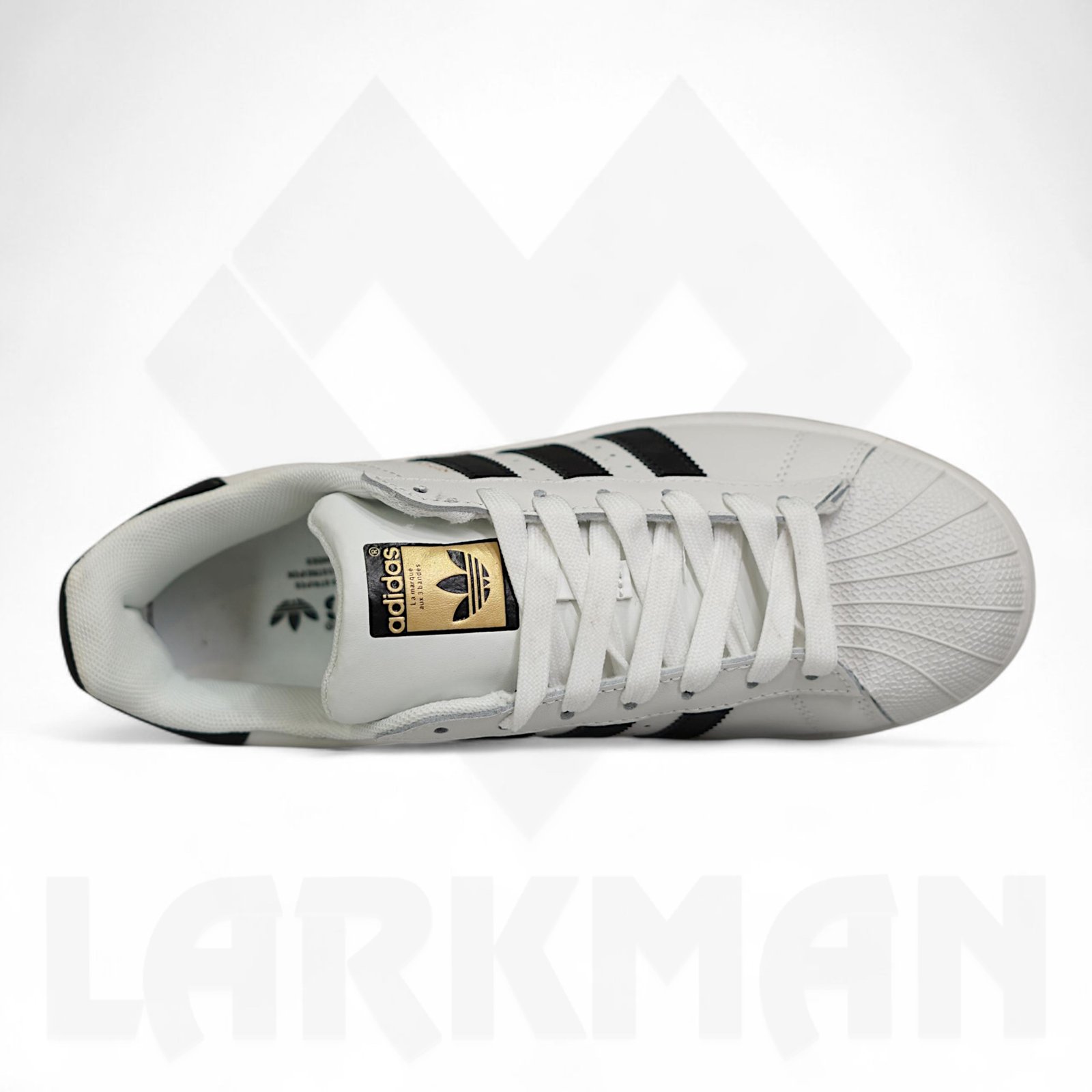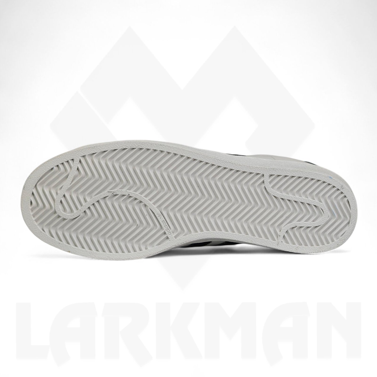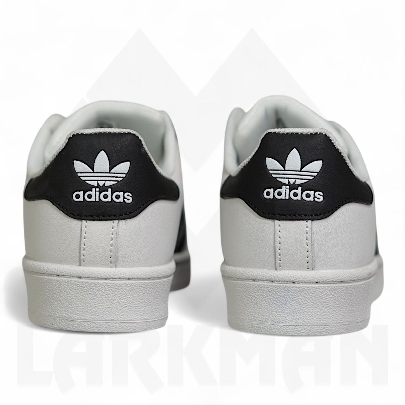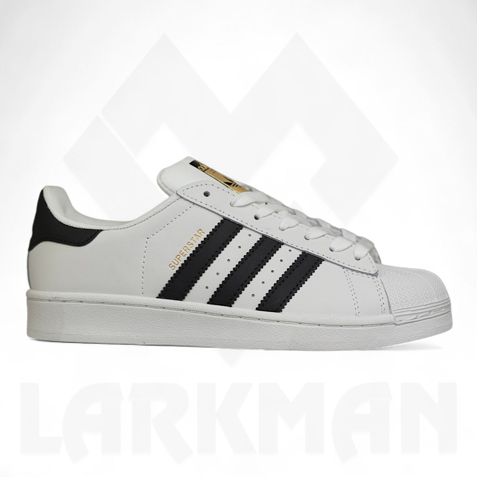 The Superstar features an iconic slip-on design with a classic black and white color scheme. Constructed with a signature "shell" design, it utilizes an elastane upper for a snug fit. Branding includes the serrated 3-Stripes and Superstar box logo, with golden details on the tongue. The shoe delivers comfort and grip through an OrthoLite sockliner and an EVA/rubber outsole with deep flex grooves.