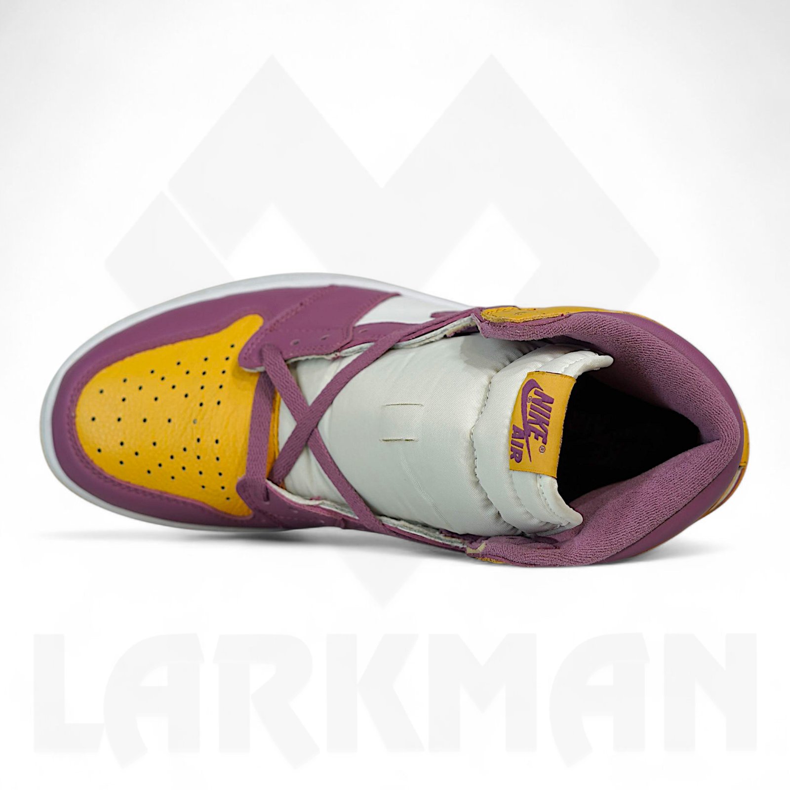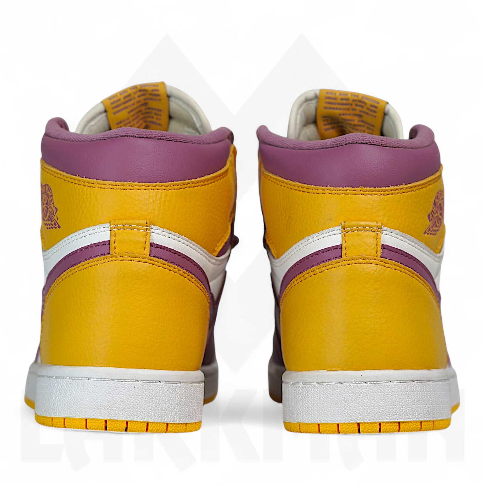 The Air Jordan 1 High "Brotherhood" honors Michael Jordan's collegiate heritage and his membership in a historic African American fraternity. Drawing inspiration from the Omega Psi Phi crest, the sneaker is crafted with a vibrant University Gold, purple, and white leather construction. The design utilizes a simple and bold color-blocking style, reminiscent of iconic past releases. Traditional details, including a woven Nike tongue label and the signature Wings logo at the collar, complete this heritage-inspired look.