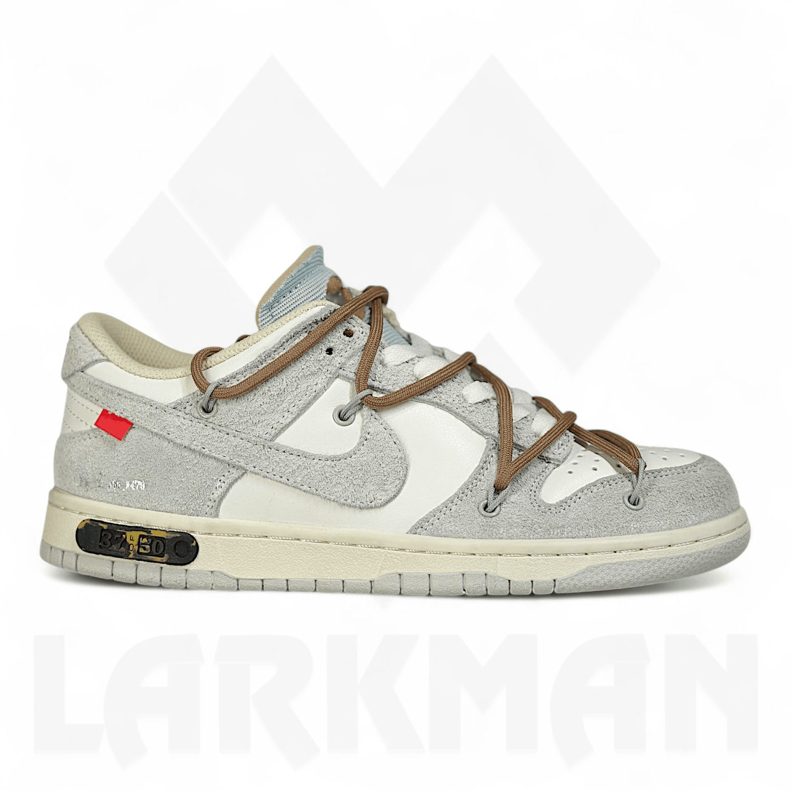 This Off-White x Nike Dunk Low from the ‘Dear Summer’ collection features a white leather upper with soft grey suede overlays. The design includes key Virgil Abloh flourishes, such as a plastic zip tie and printed Helvetica text. Contrasting pops of color appear on the secondary lacing system and the exposed-foam tongue, while a rectangular tab is affixed to the Swoosh.